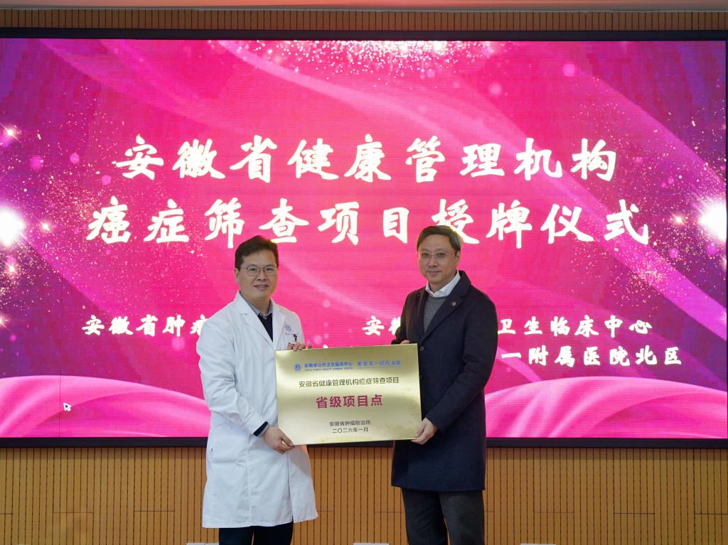 1月19日上午,安徽省肿瘤防治所副所长郑涛一行到北区交流座谈。会上,北区正式挂牌成为“安徽省健康管理机构癌症筛查项目省级项目点和技术指导单位”。北区党委副书记、执行院长李永怀参加会议。